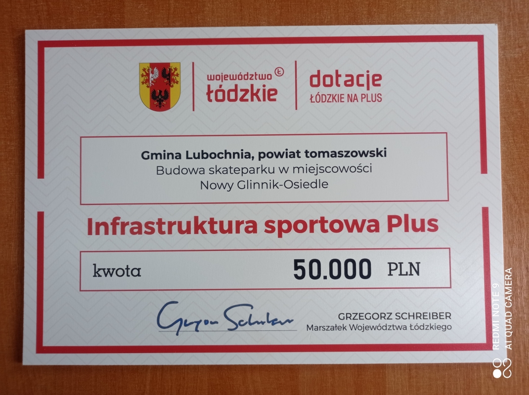 W dniu 12 lipca 2021 r. Gmina Lubochnia, reprezentowana przez Wójta Gminy p. Piotra Majchrowskiego podpisała z Województwem Łódzkim, reprezentowanym przez Wicemarszałka Województwa Łódzkiego p. Zbigniewa Ziębę i Zastępcę Dyrektora Departamentu Sportu i Turystyki p. Sławomira Piętakiewicza umowę o udzielenie pomocy finansowej jednostkom samorządu terytorialnego województwa łódzkiego w formie dotacji celowej, przeznaczonej na dofinansowanie zadań w ramach programu „Infrastruktura sportowa Plus”. Przyznana dotacja w kwocie 50.000,00 zł przeznaczona zostanie na realizację inwestycji pn.: „Budowa skateparku w m. Nowy Glinnik – Osiedle”.