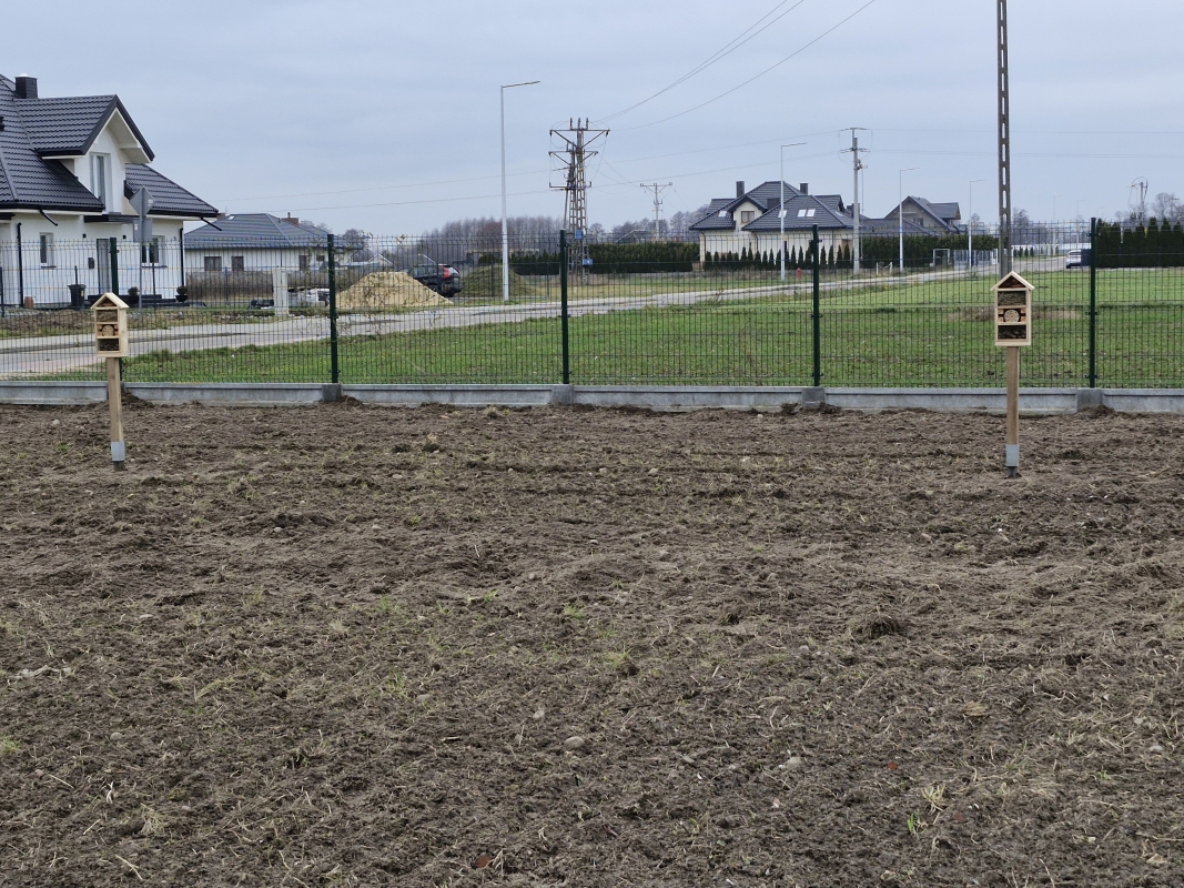 7. Zagospodarowanie pozostałego terenu w ramach utworzenia łąki z roślinami miododajnymi oraz enklawami dla dzikiego ptactwa, montaż budek lęgowych dla owadów, nasadzenie klonów, nasadzenie żywopłotu oddzielającego siłownię plenerową od urządzeń placu zabaw
